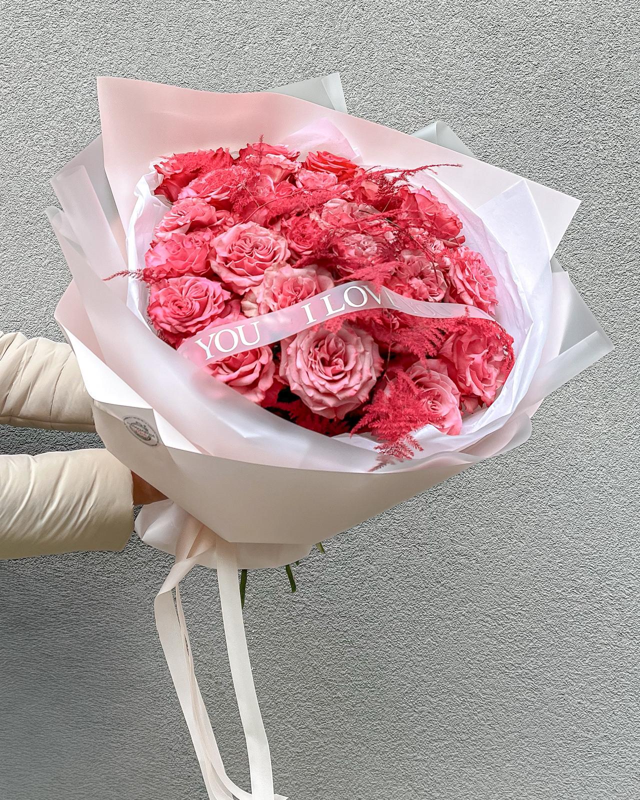 Romantyczny bukiet z różowych róż w odcieniach pudrowego i intensywnego różu, ułożony w elegancką, pełną kompozycję. Ozdobna wstążka z napisem „You I Love” podkreśla wyjątkowy charakter aranżacji. Idealny jako piękne i stylowe wyznanie miłości.